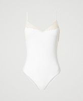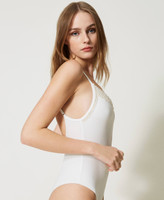 Costume intero con scollatura a V, ricamo di perle, spalline regolabili, logo sul retro.