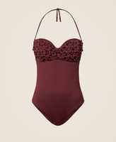 Costume intero a fascia ricamato con tecnica origami e strass cuciti. Ha coppe non estraibili, ferretto e stecche laterali, laccetti rimovibili da annodare dietro al collo o da indossare come spalline grazie alle asole presenti alle estremità, chiusura a fiocco sul retro, logo a cuore in metallo dorato sul retro.