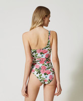 Esprimi il tuo lato più romantico anche in vacanza con questo costume intero monospalla, senza imbottitura, in tessuto italiano con stampa a rose, impreziosito da un ricamo patch asimmetrico. Raffinato e chic, lo puoi indossare anche con la cintura in vita in coordinato.