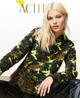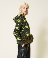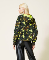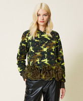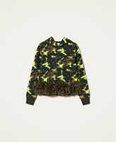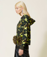 Felpa cropped collezione Actitude in cotone con stampa camouflage, collo con cappuccio, applicazione di rose in organza al fondo.