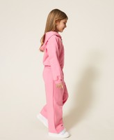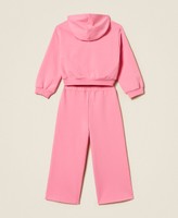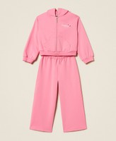 Completo da bambina in cotone stretch composto da felpa con cappuccio, chiusura con zip, tasca a marsupio, linea morbida, e pantaloni ampi e cropped con elastico in vita.