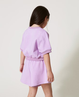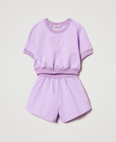 Completo da bambina in cotone stretch con profili a costine e linea morbida. È composto da felpa con Oval T embossed, maniche corte a kimono e shorts con elastico in vita.
