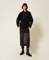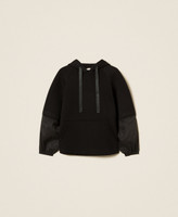Felpa in tessuto scuba con inserto in organza a fondo manica. Ha collo con cappuccio e coulisse con nastro in gros-grain lucido, polsi arricciati con elastico, tasche a marsupio davanti, linea over.
