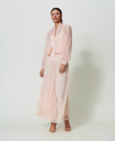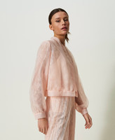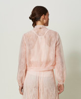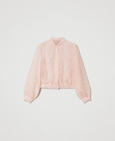 Giacca a bomber in organza foderata in pizzo Chantilly a motivo floreale, collo alla coreana, linea morbida.