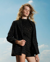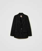 Giacca blazer in tessuto bouclé a disegno check realizzato con filo di lurex. Ha collo con revers, chiusura con bottoni neri effetto corno, maniche lunghe, tasche con patte, foderata, linea dritta.