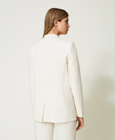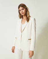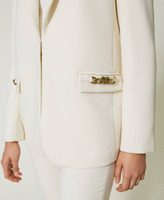 blazer in tessuto tecnico di misto viscosa dalla texture pulita, con mano morbida e confortevole. Ha linea dritta, revers a freccia, chiusura con ganci, spacco al centro sul retro sovrapposto, foderato. Le tasche a filetto sono arricchite da un inserto in catena con Oval T, che attinge agli elementi iconici distintivi della collezione borse Twinset. La puoi abbinare ai pantaloni in coordinato per sfoggiare un tailleur essenziale e ricercato allo stesso tempo.