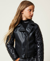 Giacca chiodo in tessuto effetto pelle con maniche in nylon trapuntato a rombi, zip in metallo.