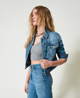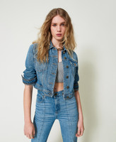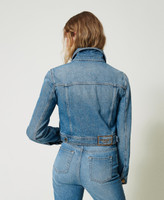 Giacca in jeans denim indaco di cotone. Ha colletto, maniche lunghe con polsino e bottone, tasche applicate con patta e inserite ai fianchi, chiusura con bottoni a chiodo e bottoni in metallo embossed gioiello con logo Oval T per collo, patte, e polsi. Lavaggio stone wash chiaro con leggere schiariture sulle spalle, linea regular.