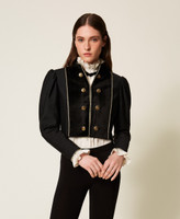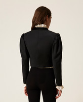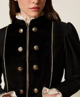 Giacca in tessuto made in Italy di lana e viscosa stretch, d’ispirazione tailoring e dall’aspetto matte. È arricchita da inserti in velluto liscio di cotone e viscosa dalla mano morbida. Ha collo in piedi, maniche lunghe con spalle arricciate e voluminose, profili a contrasto in passamaneria torchon, bottoni araldici in metallo, chiusura combaciata con uncinelli, fodera, linea fitted.