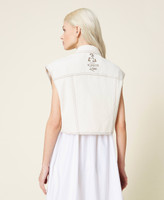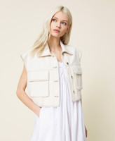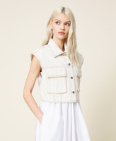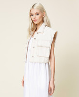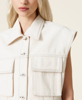 Statement item dal fascino ecofriendly. Gilet corto in bull composto dal 55% di cotone organico, con colletto, tasche applicate con patta, chiusura con bottoni logati. Il modello fa parte del conscious program Revive di Actitude by Twinset, indicato dalla scritta stampata all'interno.
