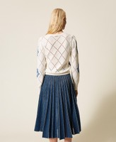 Gonna lunga in jeans di cotone con lavorazione plissé realizzata con tecnica di traforatura su ogni piega. Ha chiusura con zip al fianco e linea svasata.