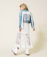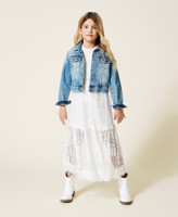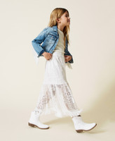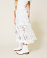 Ricercata, leggera, speciale. Scegli la gonna lunga da bambina in pizzo leggero a disegno geometrico patchwork, con balza al fondo con frange ed elastico in vita ricoperto. Perfetta con blusa e stivaletti.