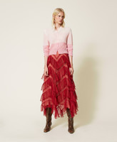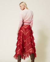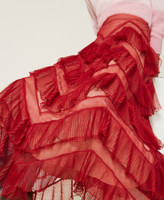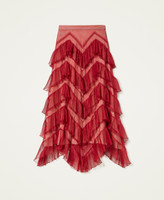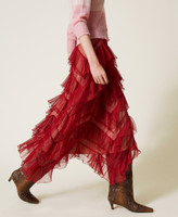 Gonna lunga in tulle leggero con balze asimmetriche in tulle plissé, zip al fianco, fodera a contrasto.