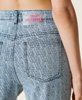 Logomania per i jeans regular jacquard con logo all over, passanti in vita, zip e bottone, cinque tasche e logo impunturato sulla tasca dietro. In coordinato alla giacca per un total look denim.