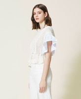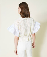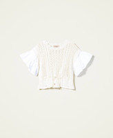 Maglia boxy in cotone lavorato con mix di punti, maniche corte ampie con balza in popeline di cotone, coulisse in vita.