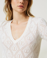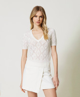 Maglia in misto cotone con lavorazione traforata a motivo monogram Oval T, scollo a V, maniche corte.