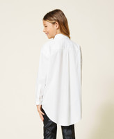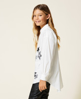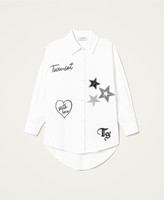 Volume maxi per la camicia da bambina in popeline di cotone con ricami, logo monogramma e patch a stelle di castoni e strass. Ha le maniche lunghe con polsino e bottone, il fondo asimmetrico più lungo sul retro. Una rilettura in stile Twinset della classica camicia bianca che troverà espressione in una miriade di look.