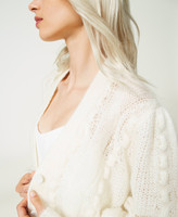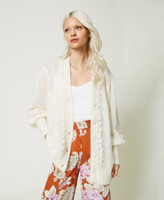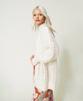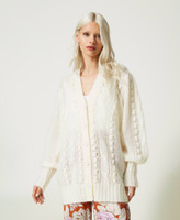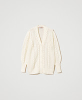 Maxi cardigan in misto mohair e lana con lavorazioni a trecce e punti a rilievo piazzati, linea morbida.