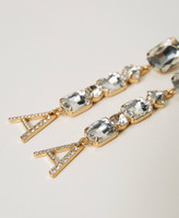Orecchini pendenti costruiti con fila di castoni crystal, logo con strass, galvanica color oro. Chiusura a perno. Per aggiungere attitudine a ogni outfit.