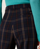 Pantaloni 'Emerald' jacquard tinto filo a base blu con disegnatura check, linea morbida, punto vita con dettaglio in raso all'interno, tasche alla francese, e tasca sul retro con bottone, piega e alamaro al fondo, chiusura con zip e bottone.