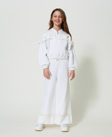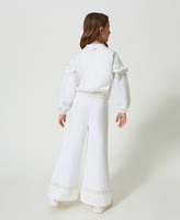 Pantaloni a palazzo in felpa di cotone stretch con banda in pizzo floreale al fondo e orlo in raso.