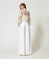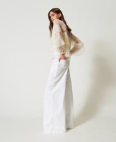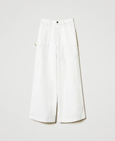 Pantaloni cargo made in Italy in bull bianco di cotone stretch con taglio orizzontale davanti e dietro. Ha vita regular, passanti in vita, chiusura con zip e bottone logato, ampie tasche davanti e applicate sul retro, etichetta in vita dietro, linea wide leg.
