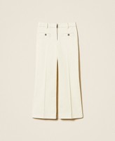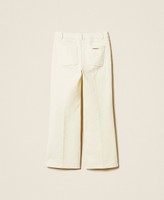 Pantaloni da bambina in bull bianco stretch con zip in metallo davanti. Ha passanti in vita, tasche a filetto con bottone in metallo davanti e tasche applicate sul retro, piega stirata, linea dritta.