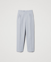 Pantaloni di ispirazione maschile realizzati in saia misto cotone e lino. Hanno la vita bassa con cintone preformato, doppie pinces, chiusura diagonale con lampo e bottone, tasche alla francese, gamba con piega stirata e linea morbida, tasche a filetto sul dietro.