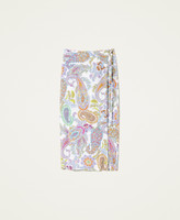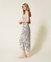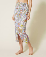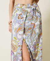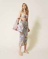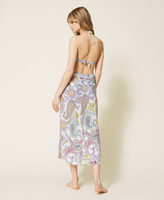 Pareo a portafoglio con stampa, chiusura con laccetti, passanti in vita, dettaglio laccato fluo.