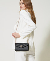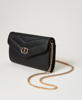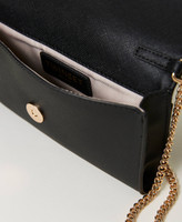 Portacellulare effetto pelle a stampa saffiano, chiusura con patta e magnete, logo Oval T in metallo, tracolla in catena.