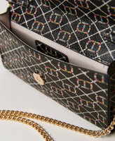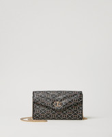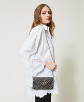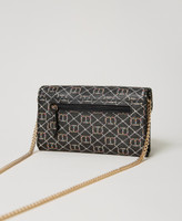 Portacellulare effetto pelle a stampa saffiano, chiusura con patta e magnete, logo Oval T in metallo, tracolla in catena.