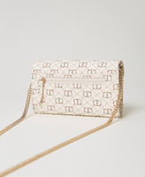 Portacellulare effetto pelle a stampa saffiano, chiusura con patta e magnete, logo Oval T in metallo, tracolla in catena.