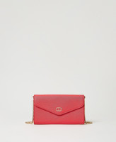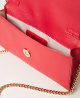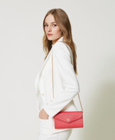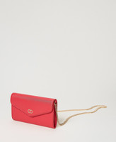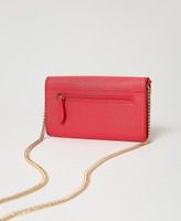 Portacellulare effetto pelle a stampa saffiano, chiusura con patta e magnete, logo Oval T in metallo, tracolla in catena.