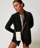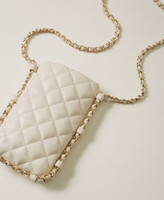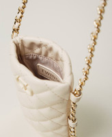 Portacellulare effetto nappa di vitello trapuntata con logo Oval T verniciato in tinta e tracolla in catena color oro con infilatura effetto pelle in tono.