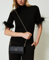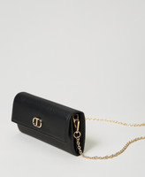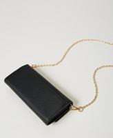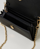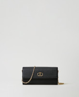 Portafoglio effetto pelle con grana saffiano e trattamento antigraffio, chiusura con patta e bottone, logo Oval T in metallo, comparti interni con portacarte di credito, tracolla cross-body in catena rimovibile.