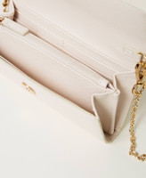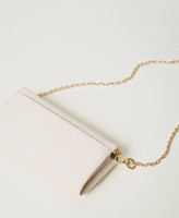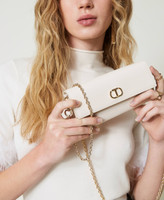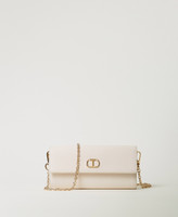 Portafoglio effetto pelle con grana saffiano e trattamento antigraffio, chiusura con patta e bottone, logo Oval T in metallo, comparti interni con portacarte di credito, tracolla cross-body in catena rimovibile.
