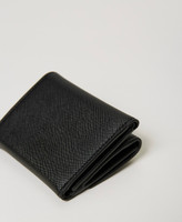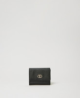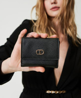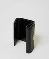 Portafoglio piccolo con Oval T in metallo, chiusura con patta e bottone, scomparti per carte, banconote e monete.