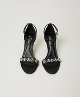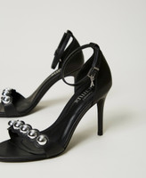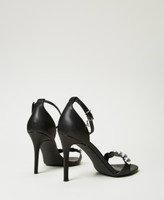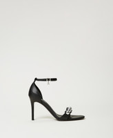 Sandali collezione Actitude effetto pelle con tacco a stiletto, dettaglio di borchie gioiello davanti, pendente logo sul cinturino alla caviglia.