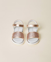 Sandali in pelle laminata con fascia glitter in tono, allacciatura alla caviglia a strappo, fondo in gomma.