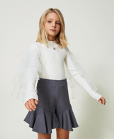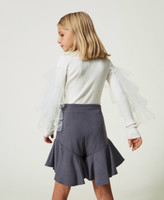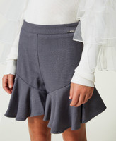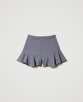 Arricchisci il guardaroba di stagione della tua piccola con questi shorts da bambina modello gonna-pantalone in tessuto tecnico mano calda stretch, arricchiti al fondo con balze che creano movimento. Linea svasata, chiusura con zip al fianco, pinces sul retro, fodera in jersey. Con la giacca in coordinato creerai un completo elegante inedito.