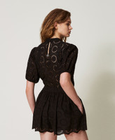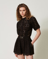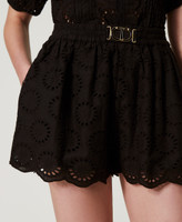 Shorts in cotone con ricamo sangallo e fibbia logata Oval T smaltata in tono. Ha elastico in vita, smerlo al fondo, linea morbida.