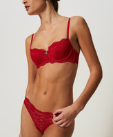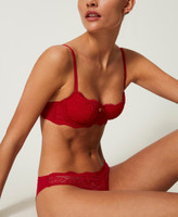 Allure comfy-chic per lo slip brasiliana, davanti in pizzo con smerlo in vita, dietro in tulle doppiato con cucitura centrale, cuore in metallo dorato con logo e fiocchetto in raso. Dai vita a un ensemble raffinato abbinandolo a uno dei reggiseni di collezione.