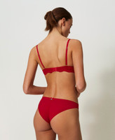 Slip brasiliana in pizzo davanti, retro in tulle doppiato con cucitura centrale e cuore con logo.