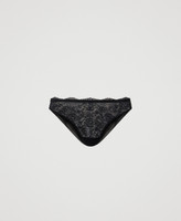 Slip brasiliana in pizzo davanti, retro in tulle doppiato con cucitura centrale e cuore con logo.