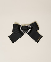 Spilla a fiocco in gros-grain con dettaglio di cuore con strass e placchetta logo sul fondo.