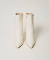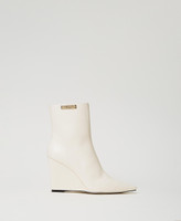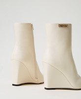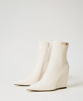 Stivaletti ankle boots effetto pelle con punta sfilata, gambale a tubo con targhetta logo, zeppa ricoperta in tono.