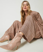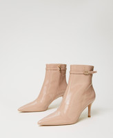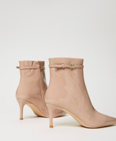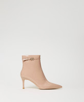Essenziali e di carattere questi ankle boots in vernice con cinturino sottile e fibbia Oval T, zip interna, punta sfilata, tacco a stiletto, fondo in tunit. Saranno all'altezza di tutti i tuoi look speciali.