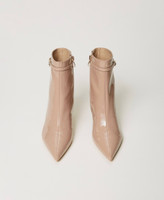 Stivaletti in vernice con cinturino sottile e fibbia Oval T, zip interna, punta sfilata, tacco a stiletto, fondo in tunit.