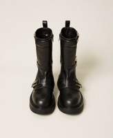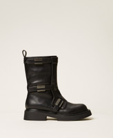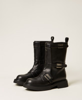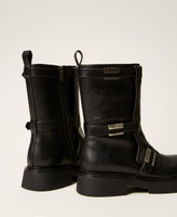 Stivali biker con cinturini e placchette logate al fianco, chiusura con zip interna, fondo in gomma.
