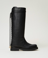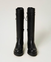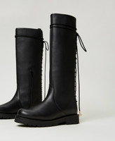 Stivali in pelle di vitello con stringhe sul retro e terminali Oval T, gambale alto, chiusura con zip al fianco, fondo in gomma.